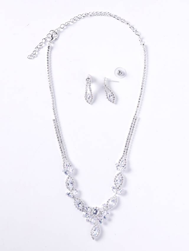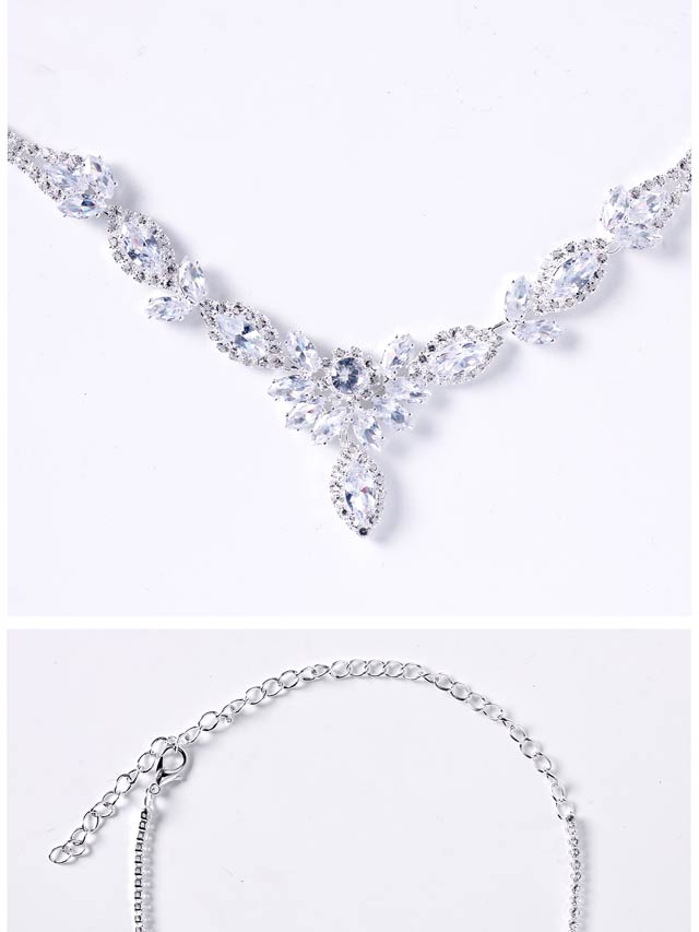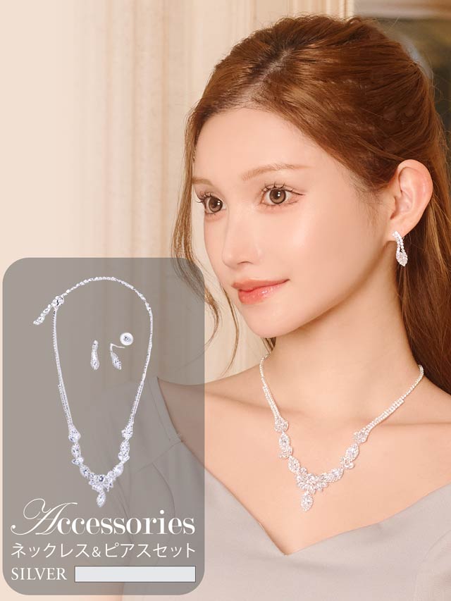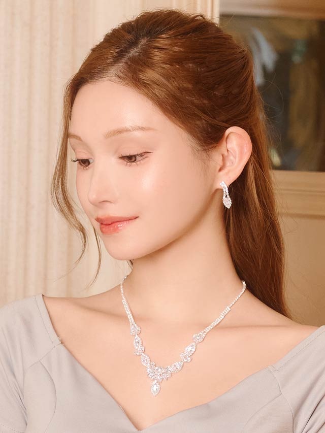 大きさの異なるリーフビジューを合わせたゴージャスなネックレス&ピアスセット。揺れ動く度に輝きを放つオーロラの美しさが高級感を与えてくれます。キャバドレスにはもちろん、結婚式やパーティーなど特別なシーンにも映えるアイテムです◎