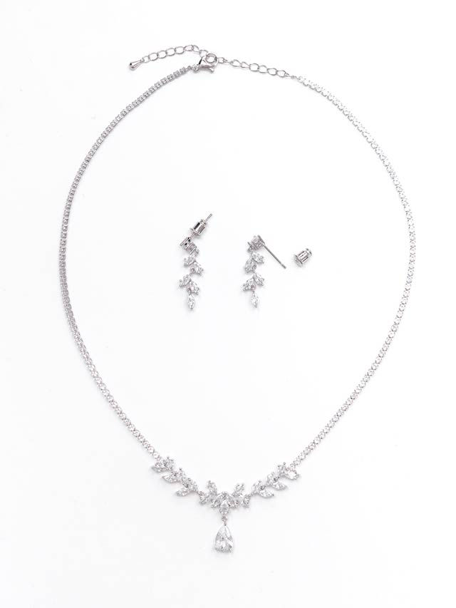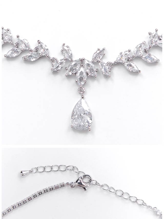 小さなリーフビジューの中から一際輝かしいドロップストーンが目を惹くネックレス&ピアスセット。被りにくいデザイン性と上品な輝きがお顔周りから存在感溢れます。パーティーシーンなどでもお使い頂けるアイテムです。