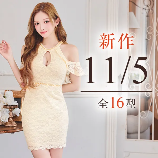 【待望のベージュ復活】3日で即完!!SEXYホルターネックゴールドチェーンメッシュタイトミニ丈キャバドレス