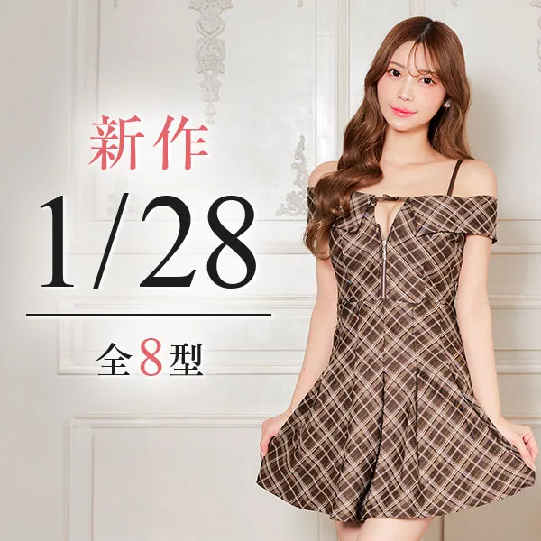 [韓国キャバドレス]ギンガムチェック肩見せオフショルレースパフスリーブタイトミニ丈キャバドレス